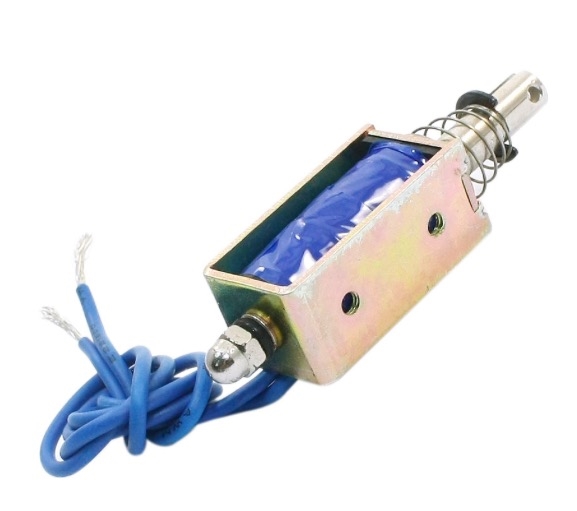 Los solenoides son básicamente electroimanes, tienen una armadura con hilos de cobre envueltos alrededor de el, cuando se energiza la bobina la barra metálica interior es atraída a el. Este micro solenoide tiene acción push pull, puede «jalar» el centro, para regresarlo/empujarlo a su posición original se utiliza un resorte exterior.